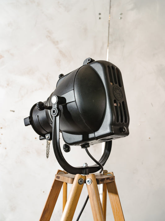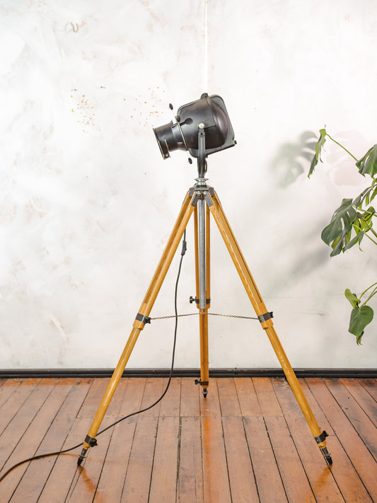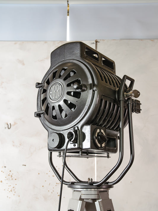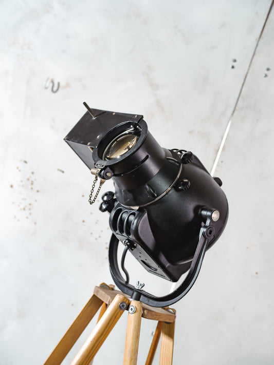 Vintage 1950s ARRI Arnold & Richter 2KW Movie Spotlight on Wooden Tripod, Industrial Hollywood Theater Floor Lamp, Fresnel stage lighting