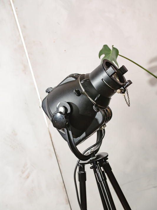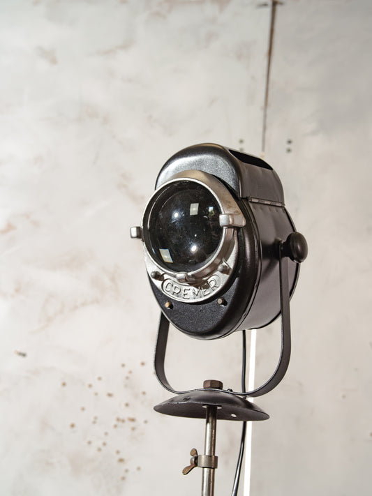 1950s A.E. Cremer Baby spotlight on original Tripod Black Floor lamp, Vintage French Theatre Light Standard Lighting