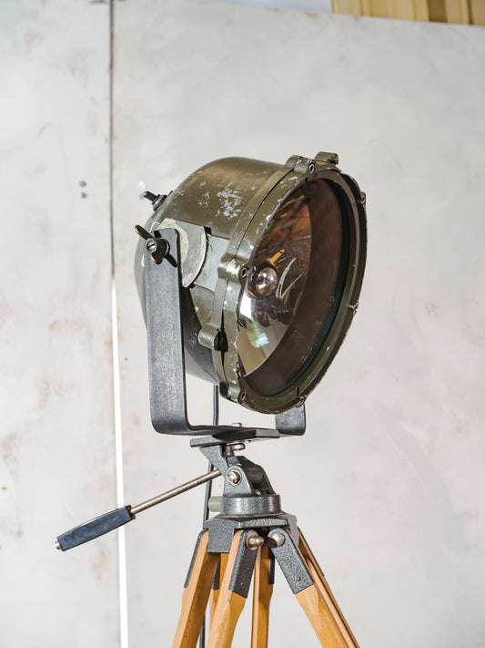 Vintage Military Leopard 1 Tank Searchlight Dutch Army on Wooden Tripod | Industrial Floor lamp Spotlight | Industrial statement Lighting