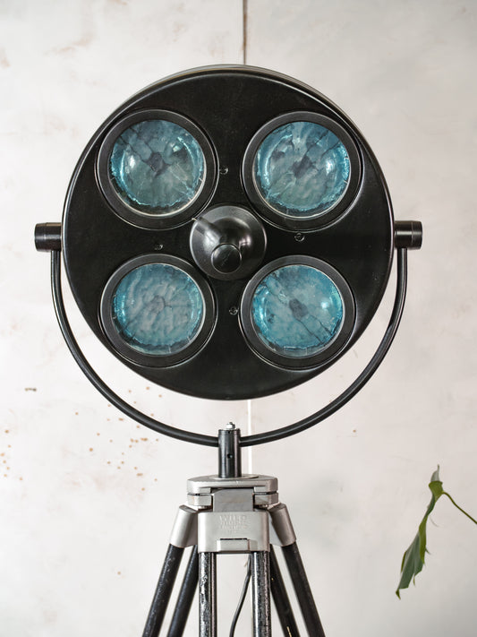 Vintage Black Repurposed Hospital Operating Lamp on Bilora Tripod, Retro Industrial Floor Lamp, Unique upcycled Surgical Lighting