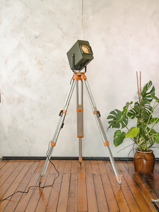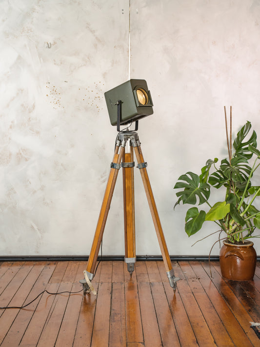 Vintage Green 1960s Strand Electric Patt 45 Theatre light on a wooden Surveying Tripod, Industrial Floor lamp, Retro Stagelight