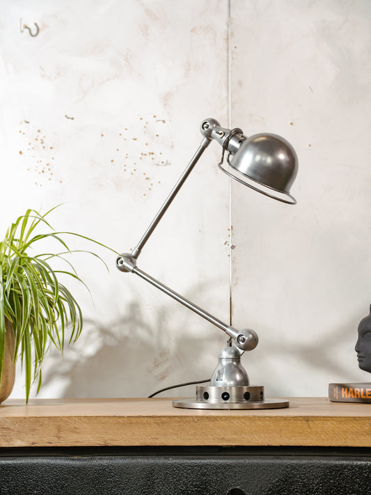 Polished 1950s Jieldé 2 Arm French Workshop Lamp on Brake disc, Jielde light, Vintage Designer Desk Lamp made by Jean Louis Domecq