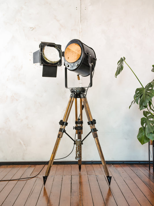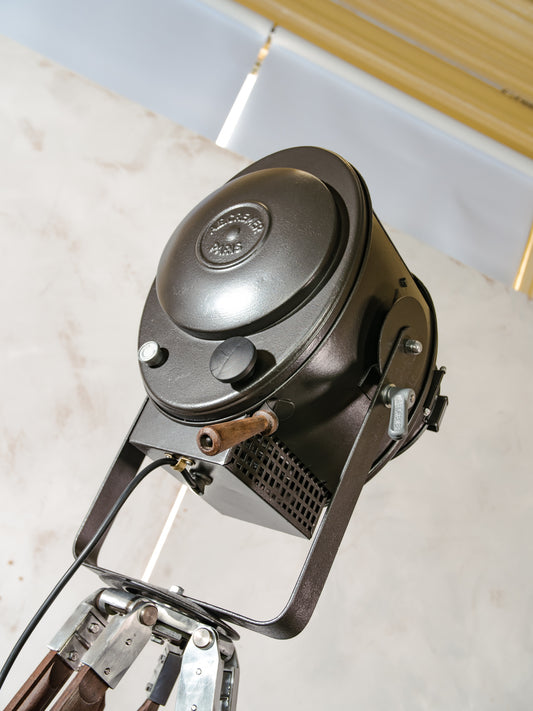 1950s Theater Spotlight Floor lamp A.E. Cremer Paris Projector on Vintage Wooden Surveyor Tripod, With Barndoors, French Antique Lighting