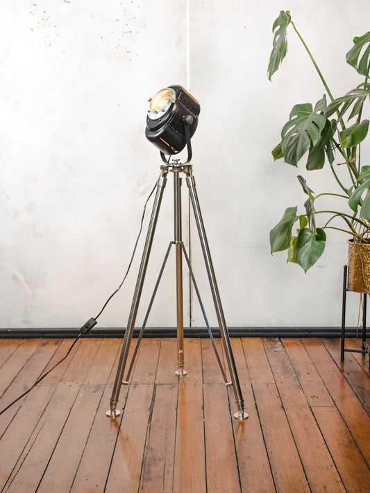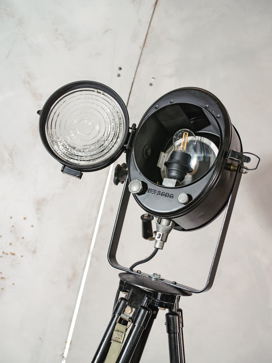 1950s Black A.E. Cremer Paris Industrial Film Spotlight Floor lamp, Mounted on Wooden Surveying Tripod, French Antique Spotlight