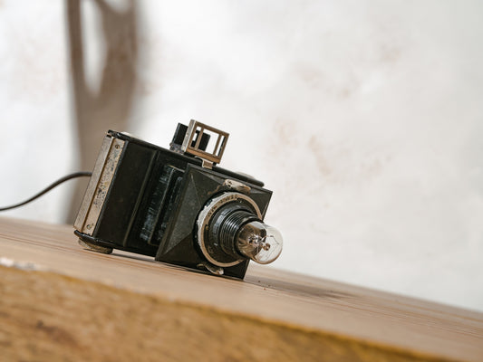 Steampunk 1930s old camera desk lamp, old folding Minolta vest upcycled into cute bedside lamp, photography office light, Gift photographer