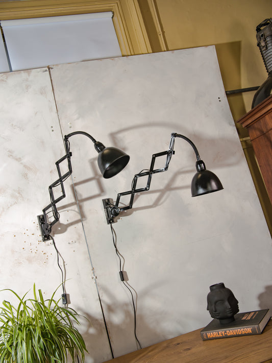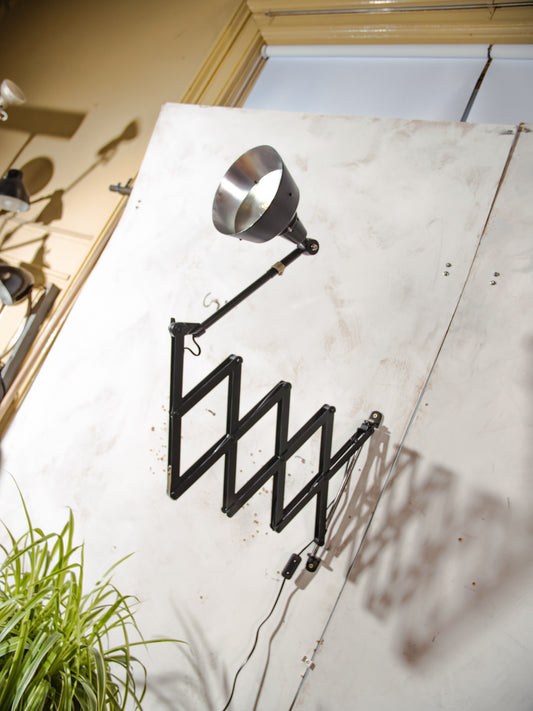 1930s MIDGARD XXL Scissor Lamp, Renovated Antique Black Workshop lamp, Rare Wall Harmonica Light, design by Curt Fischer