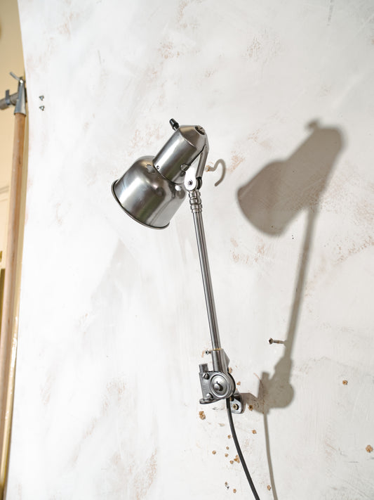 Vintage SIS Leuchten Wall Lamp, Polished Swing Arm 1950s, Silver Factory Machine drawing lamp
