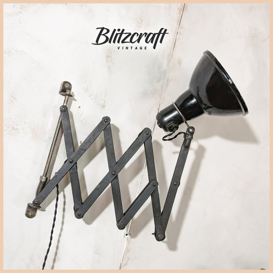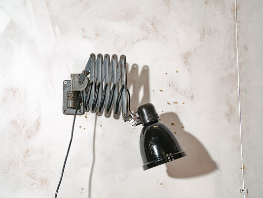 Antique Scissor Lamp by Wilhelm Bader Wagenfeld 1930s, Black Workshop lamp, Unique and rare Wall Harmonica Light, Bauhaus Enamel Lampshade