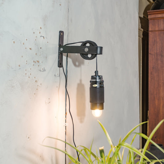 Repurposed LENS Wall lamp, Photo camera 80-200 mm RMC Tokina lighting, Upcycling Pulley light, gift for Photographers