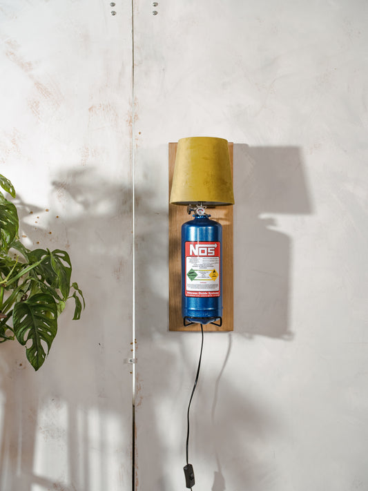 Nitrous Oxide NOS Wall Lamp Sconce, Blue Metal Bottle with Green Lampshade on Oak wood, Upcycled Fire Extinguisher, Autosport Decor