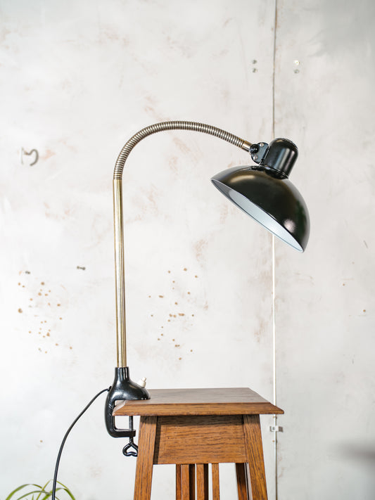 Kaiser Idell 6740 klemlamp uit de jaren 40, gerestaureerde antieke zwanenhals werklamp, Bauhaus-ontwerp van Christian Dell met super lampenkap