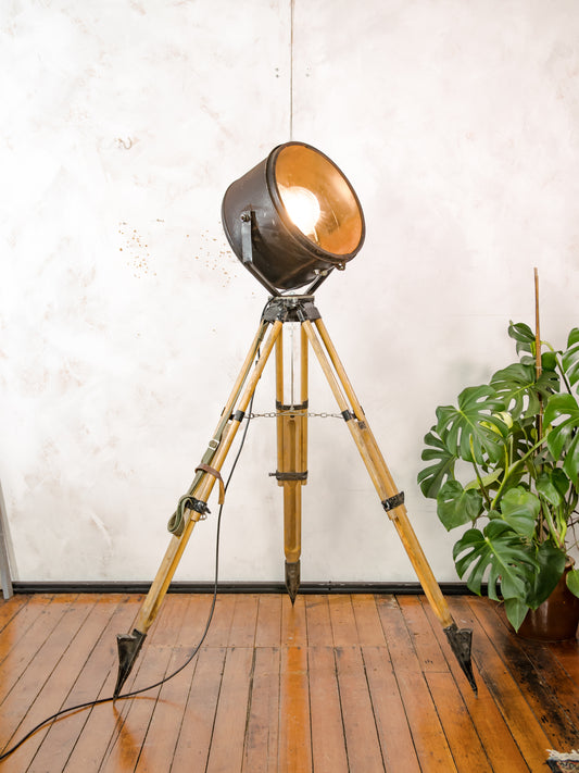 Vintage militair scheeps zoeklicht op houten landmetersstatief, industriële staande lamp spotlight | Unieke statieflamp
