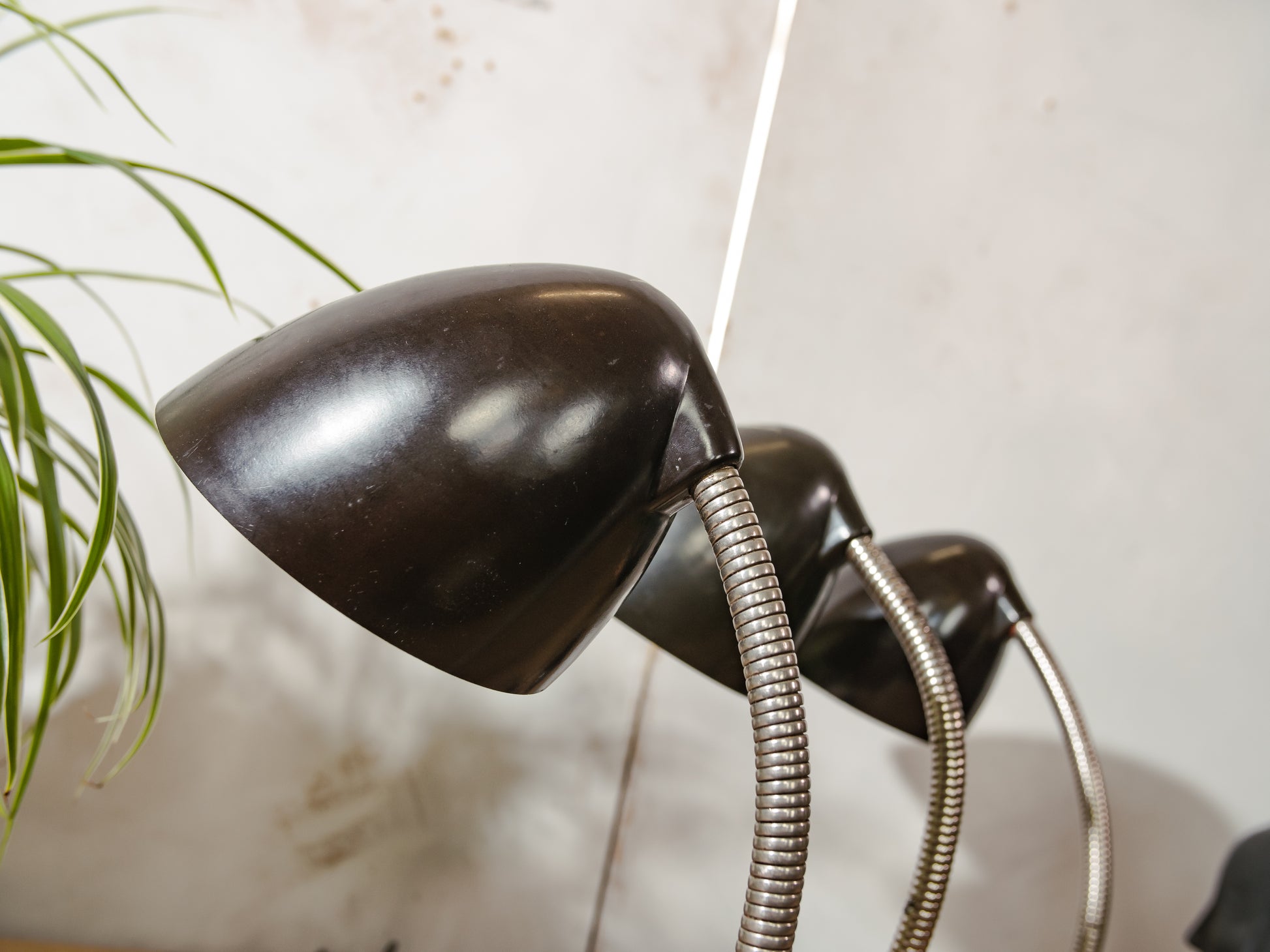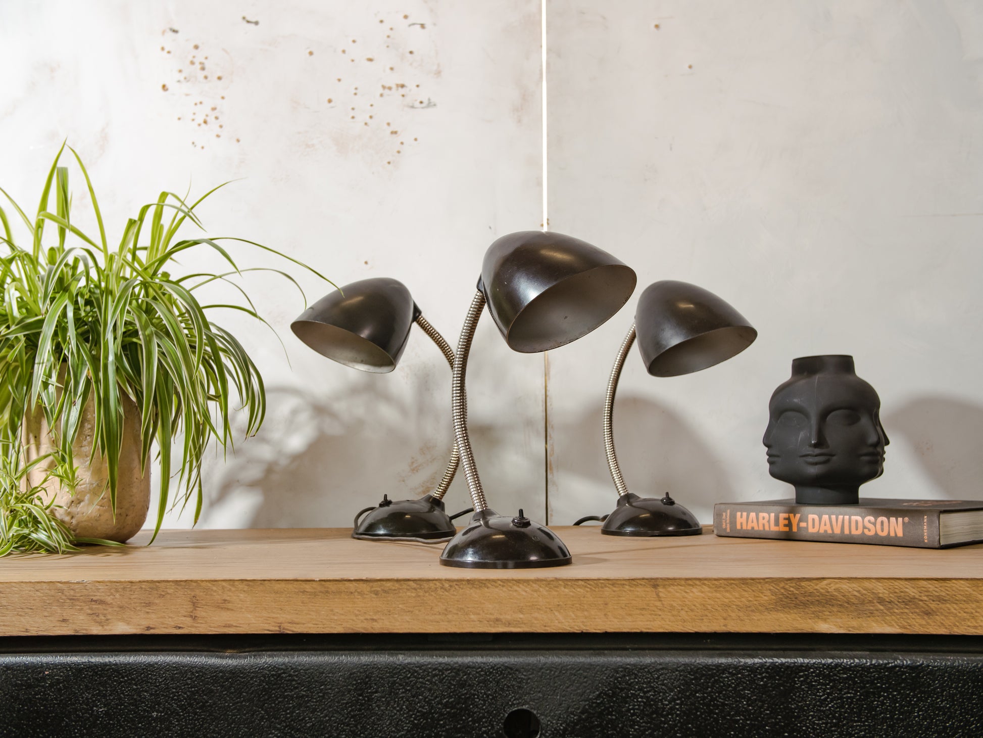Elke lamp (model 11105) is gemaakt van origineel bakeliet en heeft een flexibele zwanenhals, een grijze reflector aan de binnenkant, een E27-fitting en de originele schakelaar op de voet. Elk exemplaar is professioneel opnieuw bedraad voor de veiligheid, zodat hij direct klaar is voor gebruik.