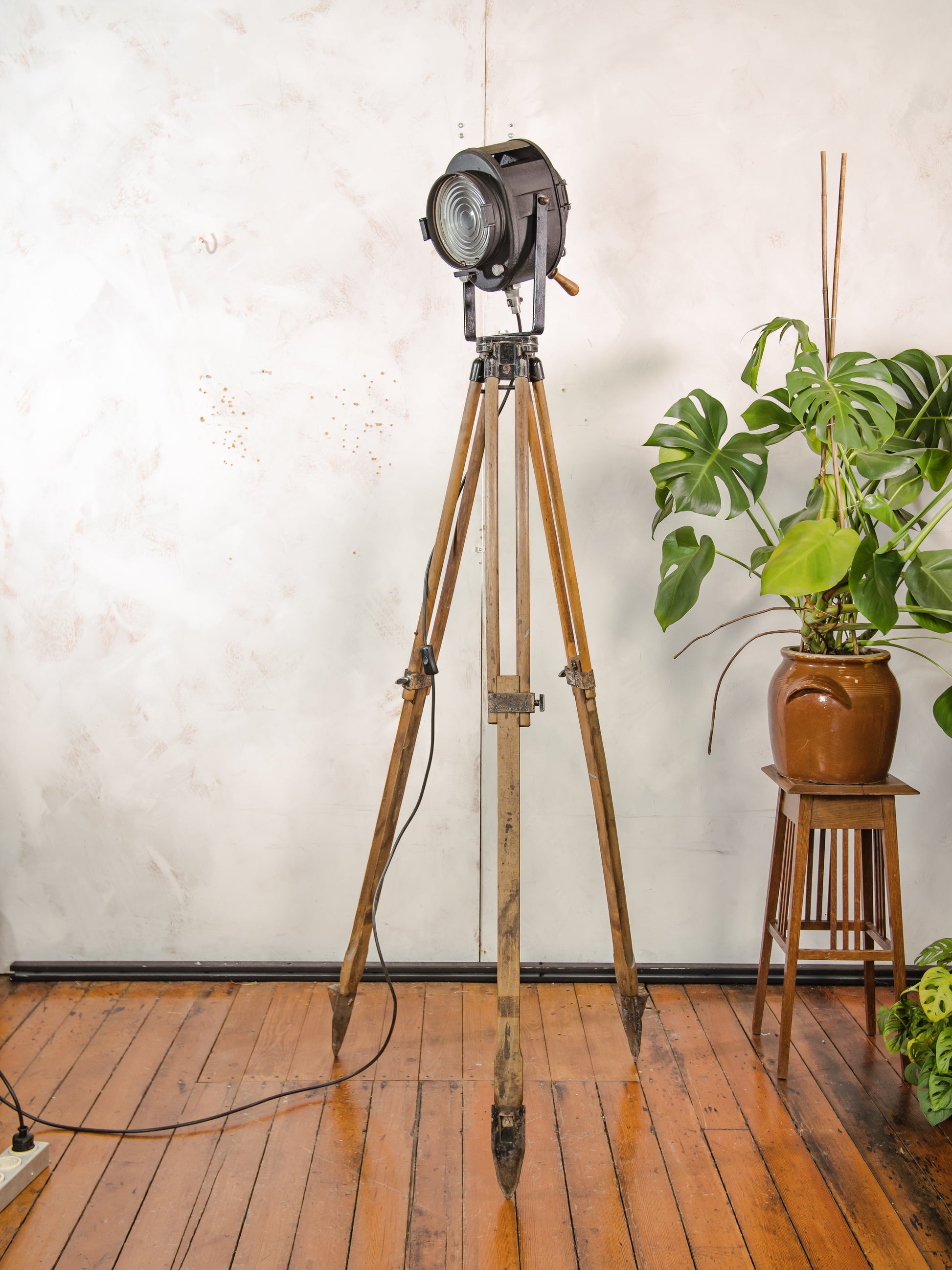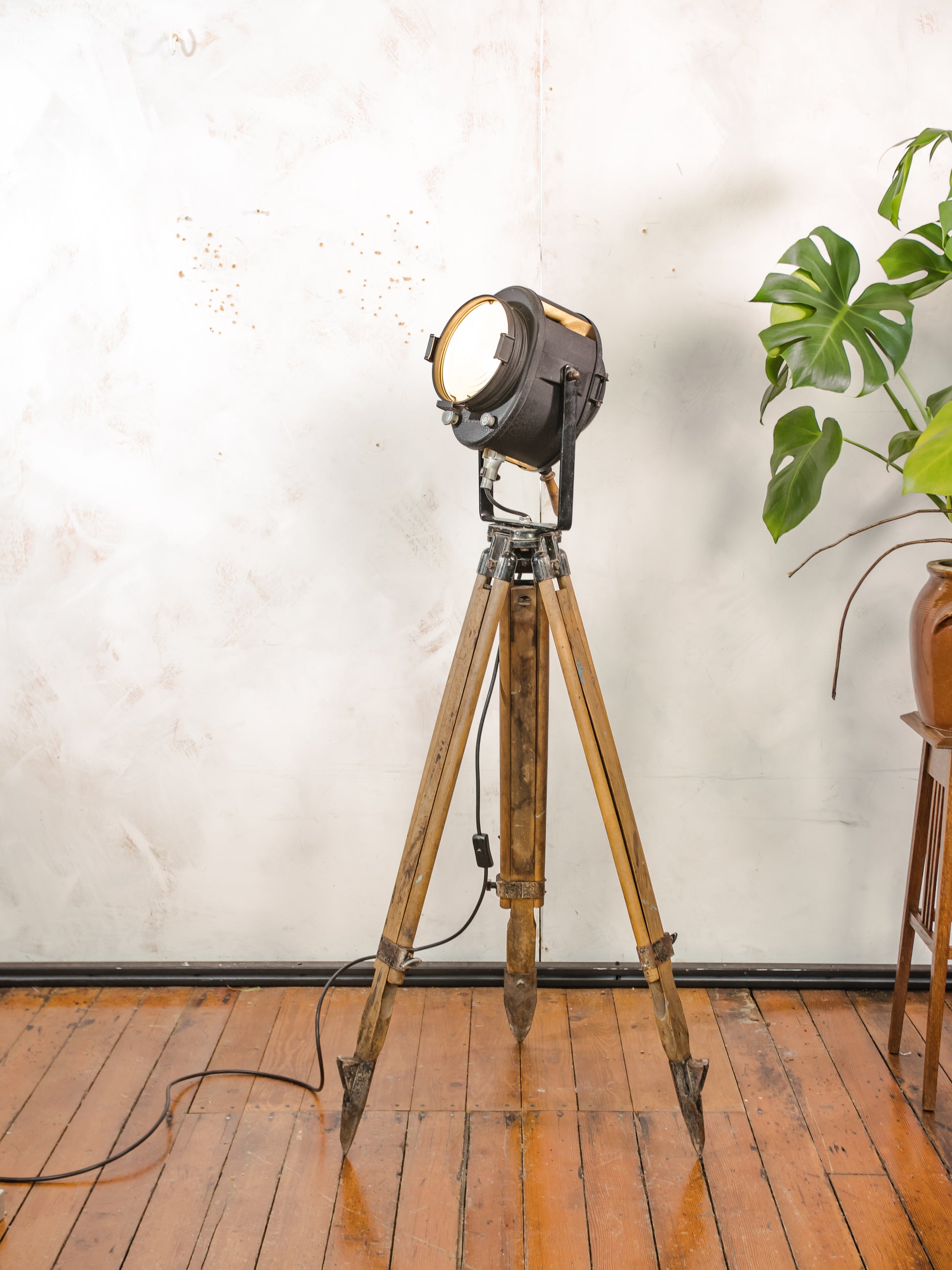 Black, original paint 1950s A.E. Cremer Paris Film Spotlight on a Vintage Wooden Surveyors Tripod, Theatre lamp, Loft Fresnel Floor lamp, French Antique projector.