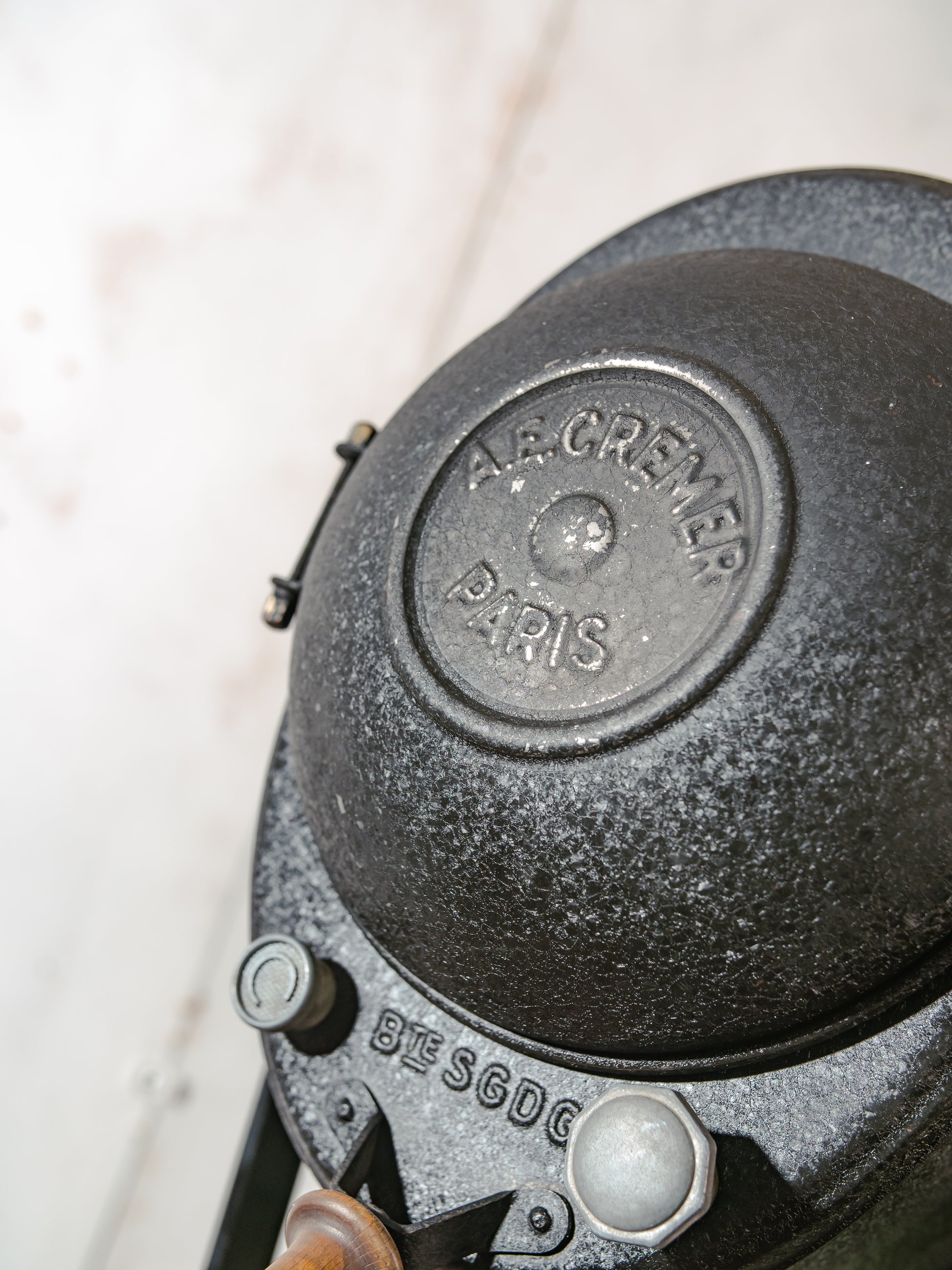 A.E. Cremer Paris Industrial Theater Floor lamp, Black 1950s Film Projector on Wooden Survey Tripod, Loft lighting, French Antique Spotlight
