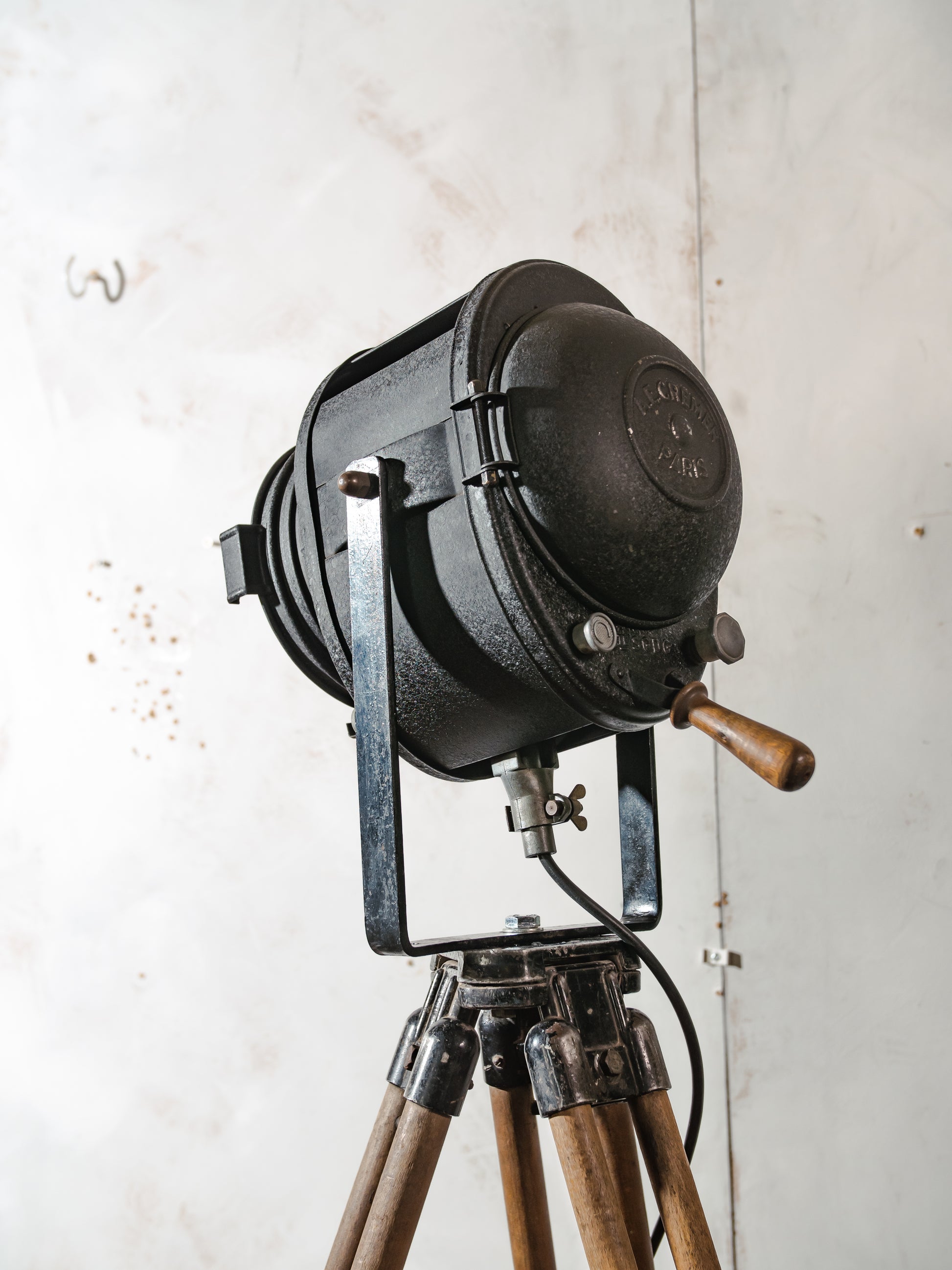 The lamp has been rewired and holds an E27 fitting with new switch and EU plug. The lamp can now be used with any type of LED or light bulb. The light bulb shown in the picture is included. The theater floor lamp is adjustable in many directions. The light/fitting is adjustable by using the original knobs, which will adjust the spot to flood beam. This Vintage Theatre light is an original vintage item, meaning there are signs of wear, making it highly unique.