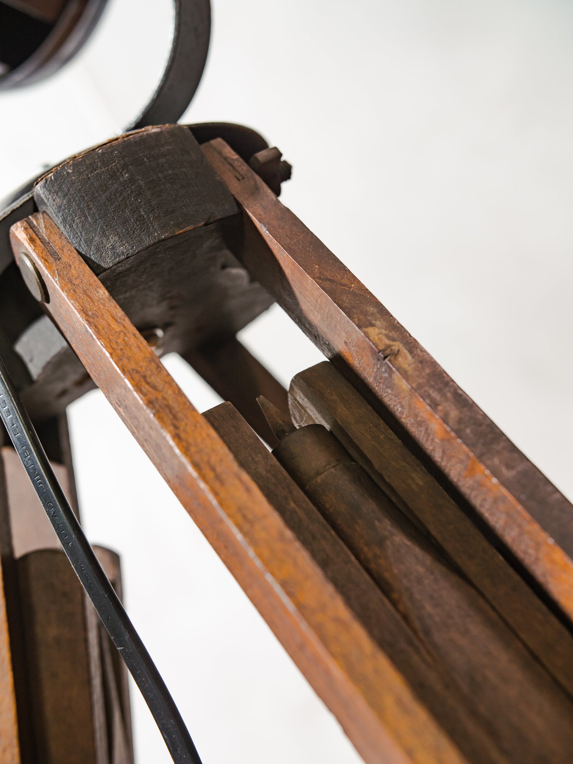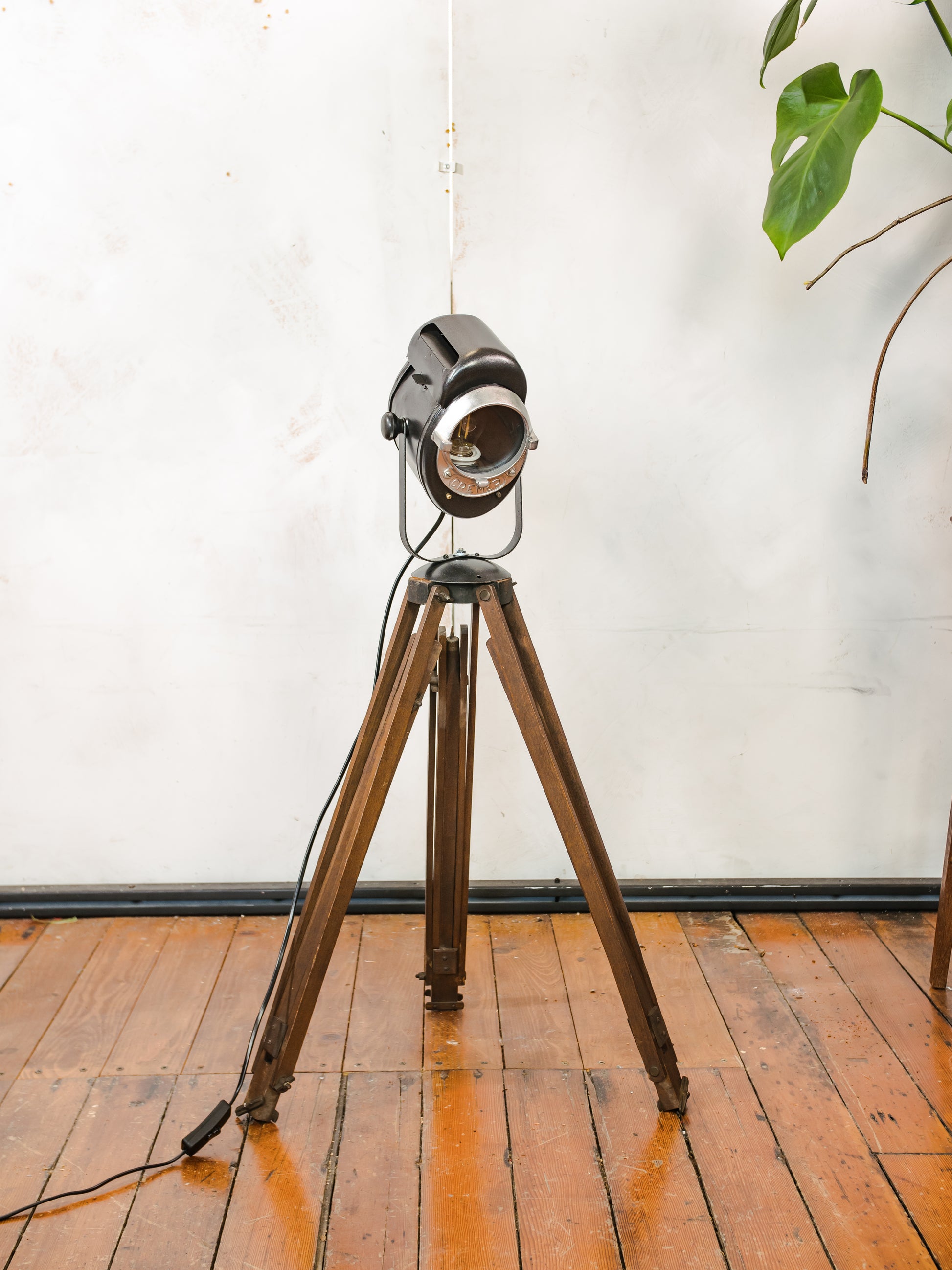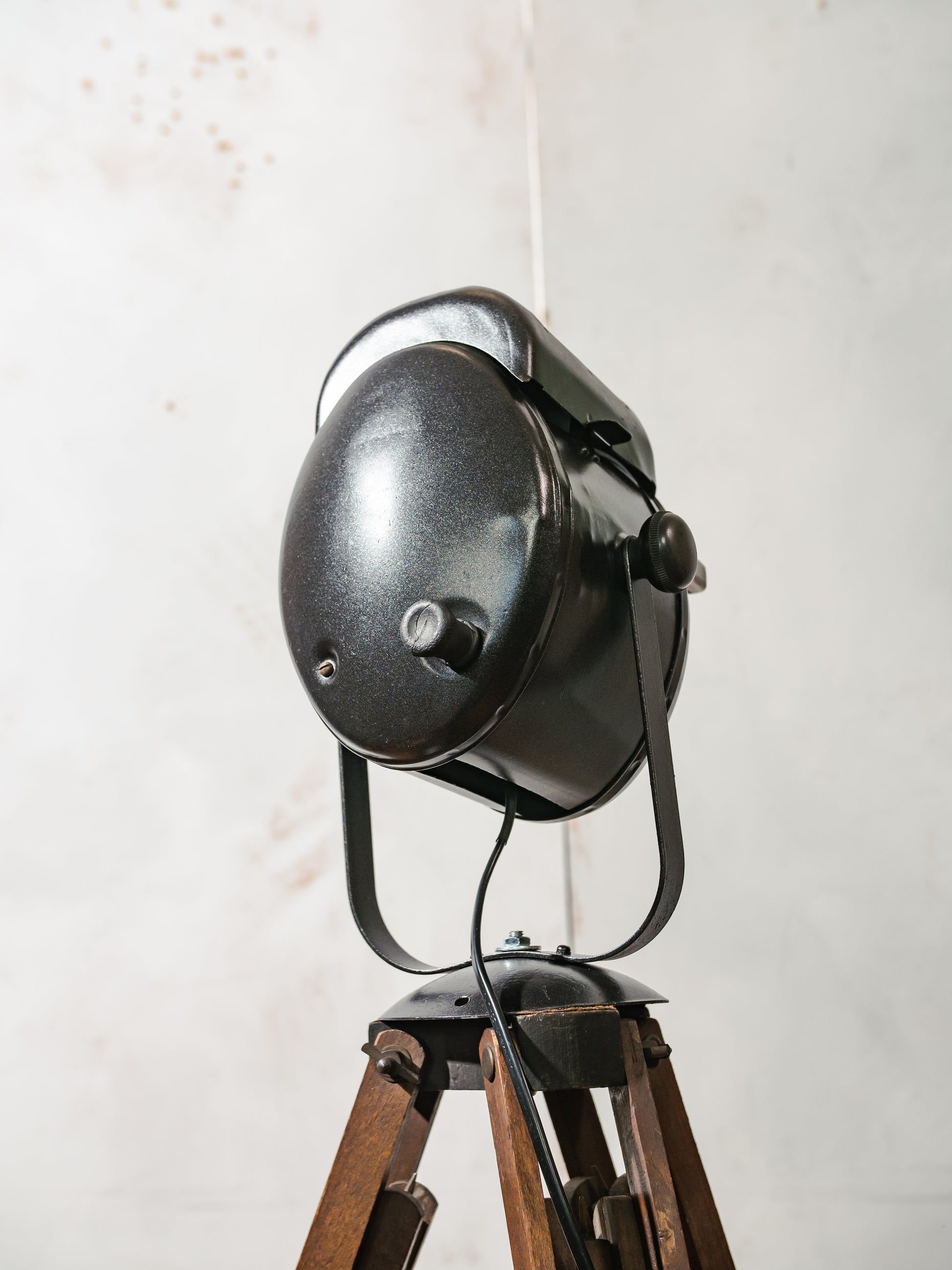 This captivating Vintage French 1950s A.E. Cremer Paris Babyspot Theatre Lamp on a Wooden Tripod transports the golden age of cinema into your home.