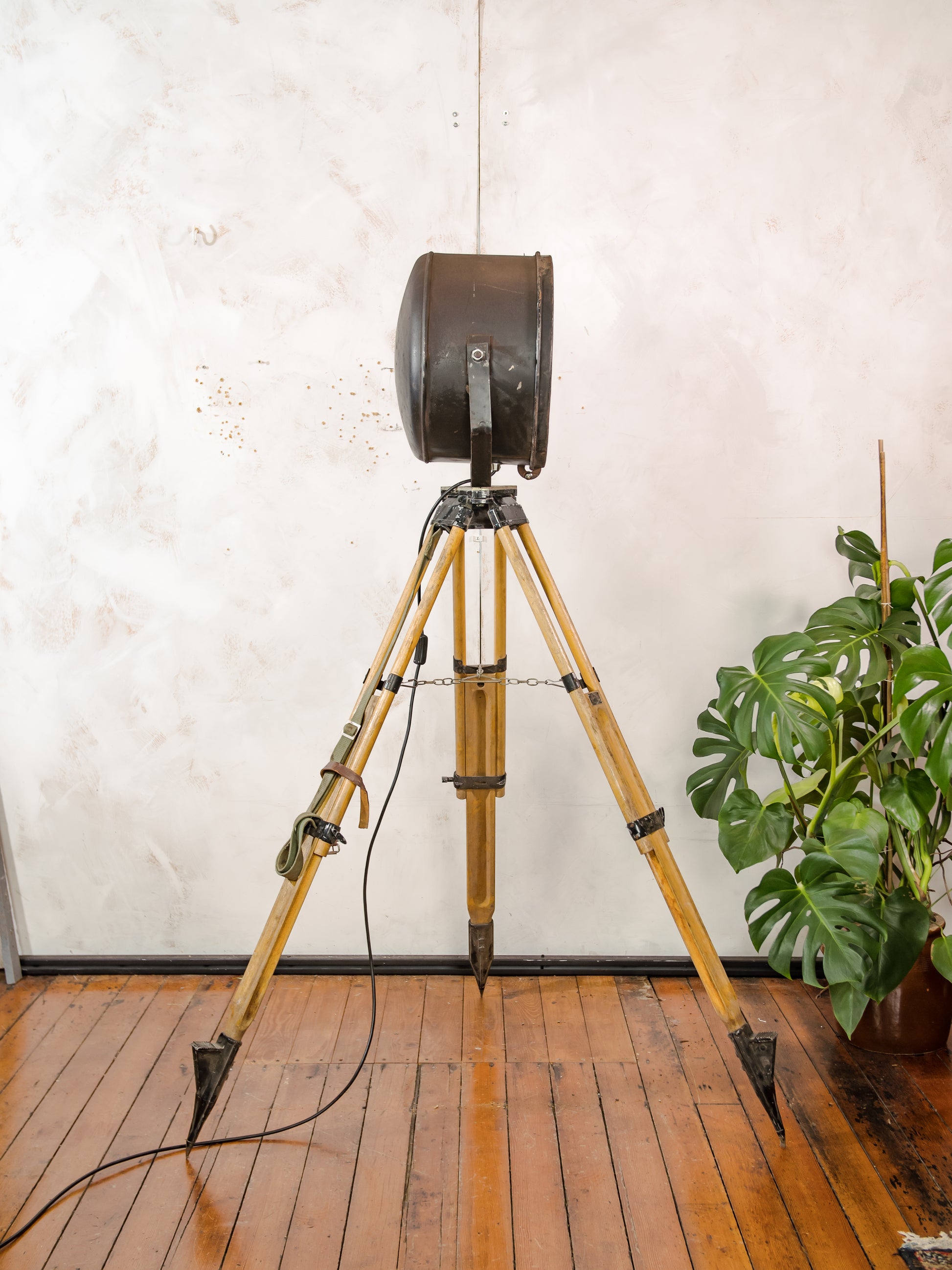Vintage Military Ship Searchlight on Wooden Surveyors Tripod, Industrial Floor lamp Spotlight | One of a kind Tripod light